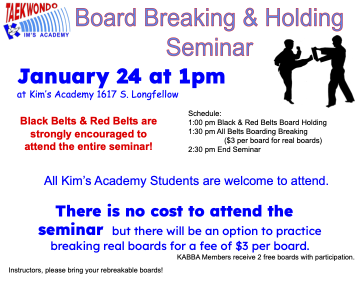 Kim’s Academy is planning a board breaking and holding event in January. The event is free for all Kim’s Academy students, including practice breaking rebreakable boards. If you would like to break real boards, they can be purchased for $3 each.